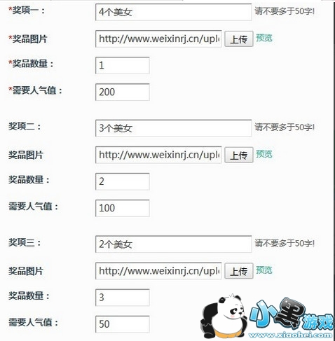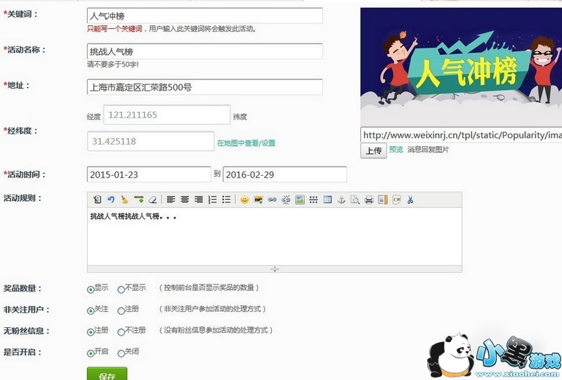 4、填写活动设置与奖项设置。注意关键词和经纬度的设置,完了点保存继续下面的填写,温馨提示:推荐每个奖项的人气值最好从小到大进行设置。奖项最多设置4个。单个奖项参数请填写完整,否则前台将不予显示。奖品图片宽高比例请尽量一致