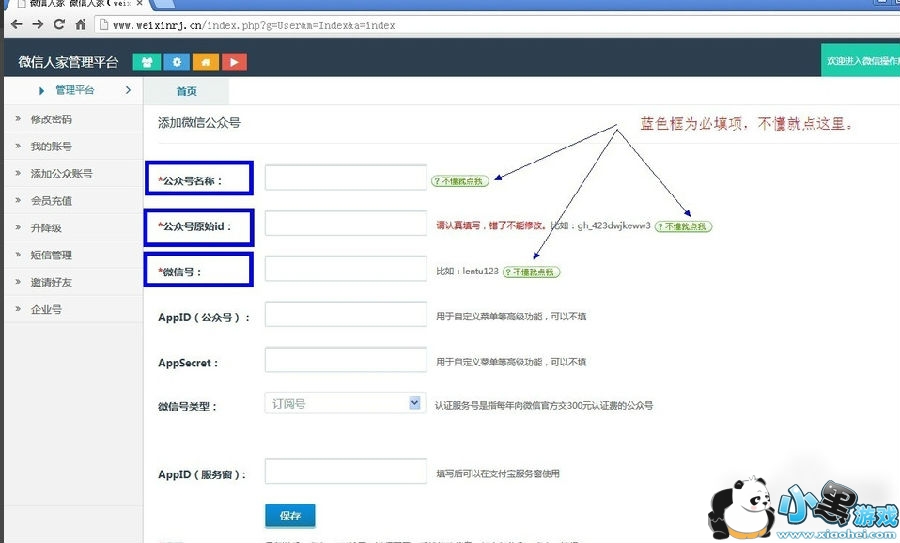 2、按照页面提示填写相关信息,不懂的可以点击后面的帮助图标。注意前三项是必填的,AppID、AppSecret这两个是使用自定义菜单需要用到的,如果你是订阅号,请认证后再填写,否则先空着。填完之后点击保存,进行下一步。