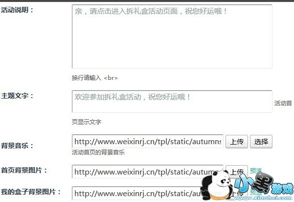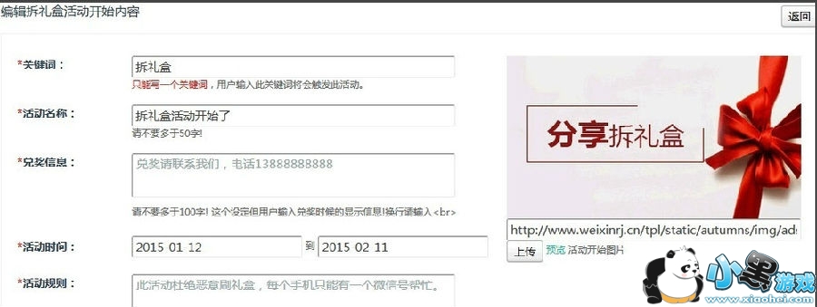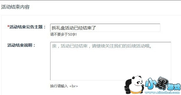4、然后大家就可以开始填写里面的礼盒内容,填写活动结束内容,包括公告主题,封面图片等。