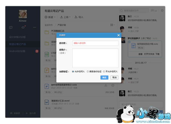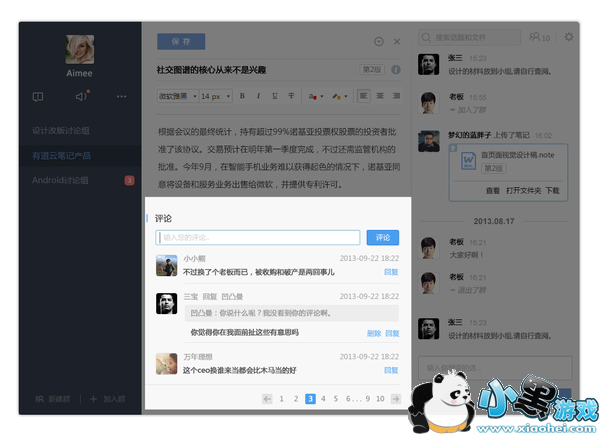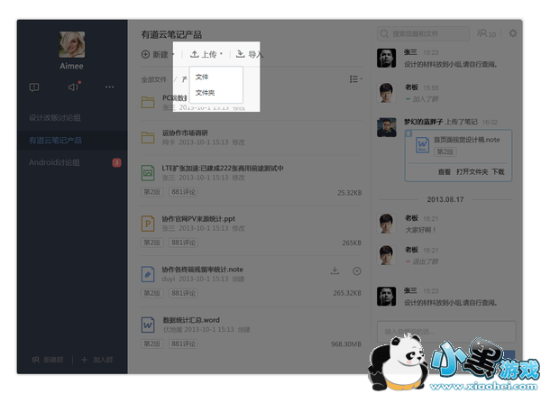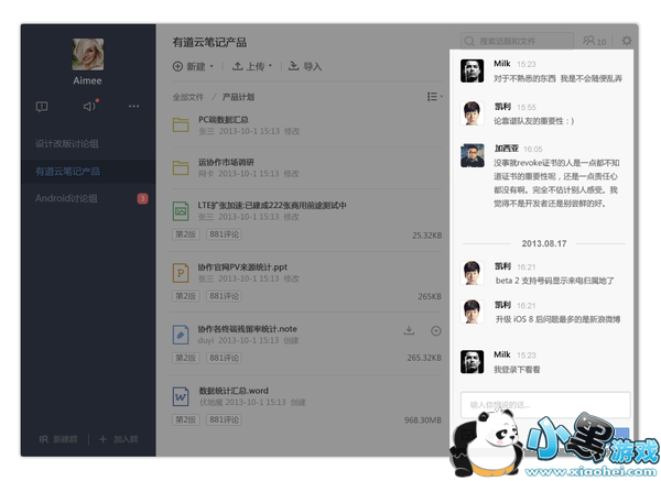 先看看有道云协作的主界面,界面分为左侧的“群列表”区域,中部的“资料库”区域和右侧的“讨论区”。