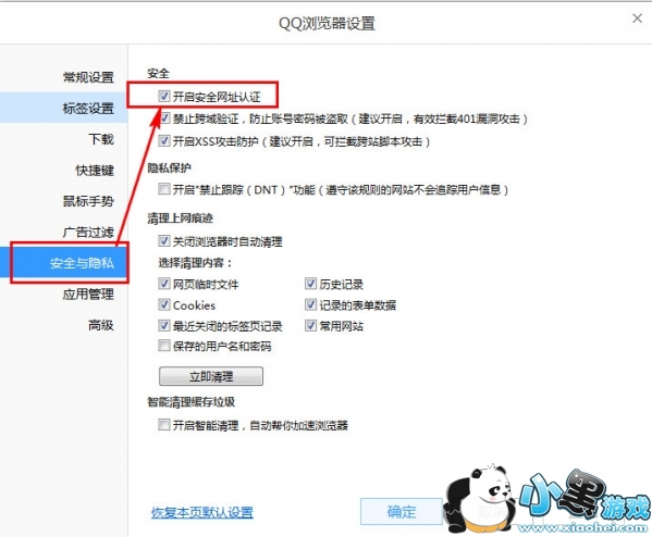 3、进入“安全与隐私”==开启安全网址认证==点击确定