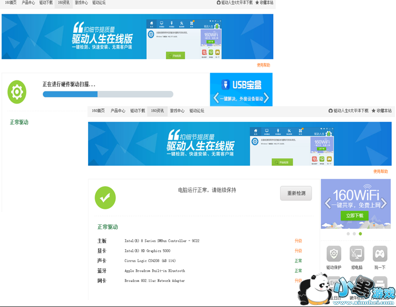 一切准备工作做好之后,就可以点击网页上的“开始检测”按钮检测电脑驱动了。检测完毕,驱动人生在线版会显示全部检测结果。如通过在线版的检测,小编的电脑驱动是正常的,但有可以优化的项目,主板、显卡和网卡驱动都可以进行升级。值得一提的是,如果驱动人生在线版没有提醒您需要修复电脑的驱动,即使可以升级单个驱动,也可不必理会。因为最新的驱动并不一定是最适合电脑、最稳定的驱动。