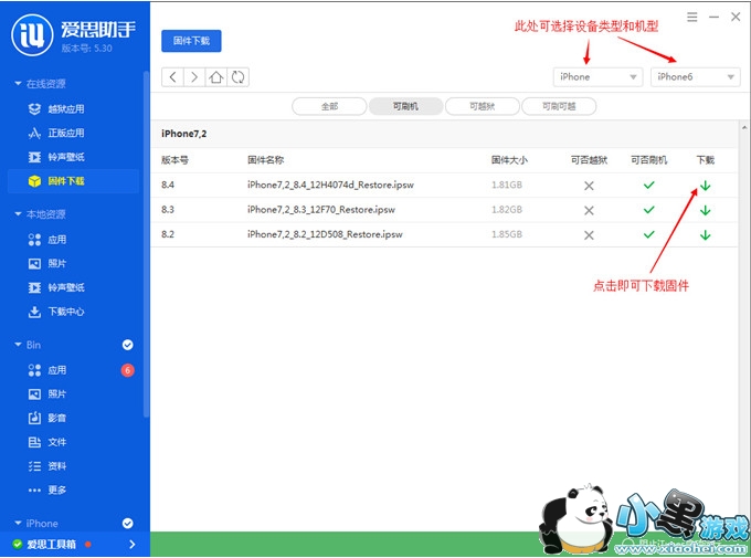 1、下载安装好爱思助手最新版本之后连接手机,到爱思助手“在线资源-固件下载”区下载手机相对应的iOS 8.4 Beta1固件,点击即可下载。