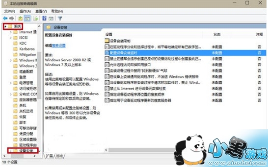 2、选择计算机配置→管理模板→系统→设备安装,然后在右边找到“配置设备安装超时”并双击打开。