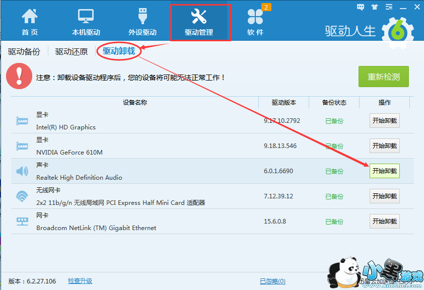 首先您下载驱动人生,点击驱动管理——驱动卸载——开始卸载,先卸载掉电脑里面原有的驱动,然后重启电脑。