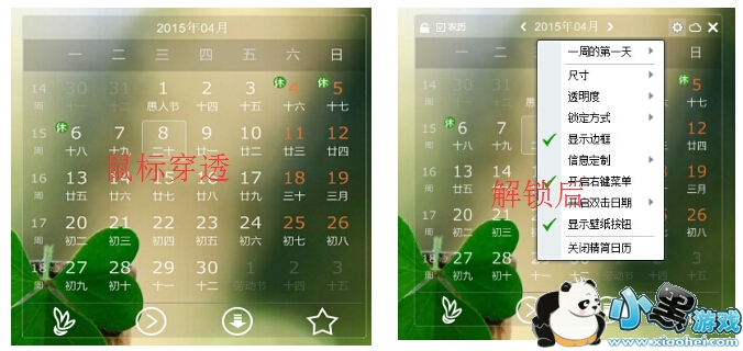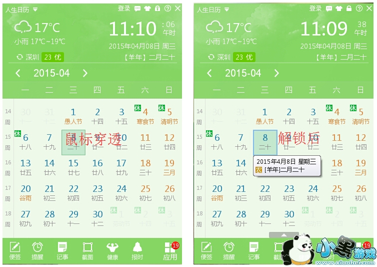 解锁后当鼠标移到日历方格上,人生日历会将当天的阳历农历等信息都显示出来。鼠标穿透时,点击人生日历的任何按钮都是没用的,包括将人生日历设置成鼠标穿透的小锁。有些童鞋不小心将人生日历设置为鼠标穿透后手忙脚乱,不知道该怎么设置回来。