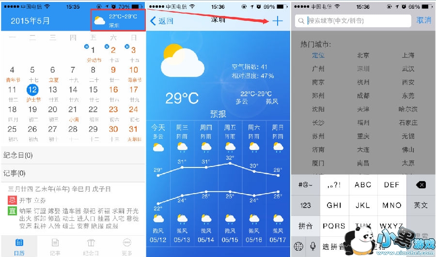 点击IOS版的人生日历主界面右上角的当天天气,即可查看未来一周的天气情况。如果您想查看多城市天气预报,那就在一周天气的页面上点击加号,即可添加查看天全国各大城市的天气,左右滑动即可切换。