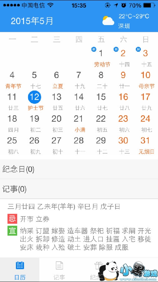 IOS版的人生日历界面简洁,功能也更加精简。主界面上用红色字体标注出每个月的节假日,界面的最下方一排依次是功能按钮。整个界面主次分明,走的是清新简约范。一个界面就能看到所在城市的天气,节假日,界面的中部还有当天记事和纪念日的预览。基本想搜寻的信息都在主界面。