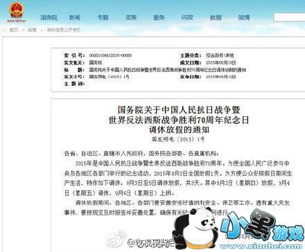 2015年是中国人民抗日战争暨世界反法西斯战争胜利70周年。为使全国人民广泛参与中央及各地区各部门举行的纪念活动,2015年9月3日全国放假1天。为方便公众安排假日期间生产生活,特作如下调休:9月3日至5日调休放假,共3天。其中9月3日(星期四)放假,9月4日(星期五)调休,9月6日(星期日)上班。