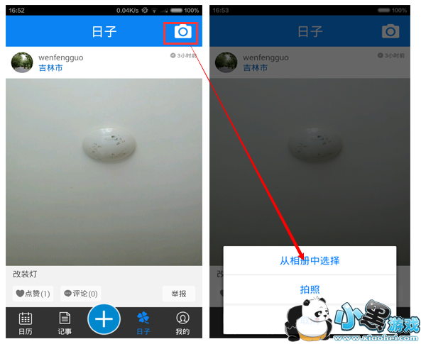打开日子,就能看到全国各地的小伙伴分享的图片,您可以对图片点赞和评论。看看别人的生活是怎样的,然后可以将自己的生活分享给别人看。点击日子右上方的照相机按钮,就能实时拍照或从相册中选择照片上传到日子。