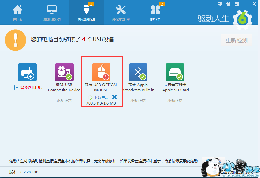 根据提示装好驱动人生后,在主界面找到外设驱动,如果它会很清晰的显示您的电脑目前连接了几个外设设备。如鼠标驱动有问题时,它会显示成一个感叹号,您只需点击一下有感叹号的图标,驱动人生会帮您立即修复。