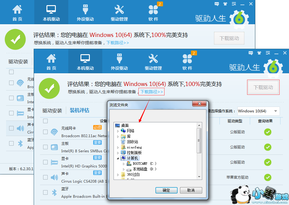 整个评估过程不超过5秒钟,您即可看到评估结果。如下图,小编的电脑100%支持Windows10(64)系统,这说明,小编的电脑如果升级到Windows10,是可以完美运行的。为了能快速安装好Windows10系统,驱动人生还支持让用户提醒下载好Win10驱动,打开“下载路径”,选择非系统盘的磁盘来保存Win10驱动,然后点击“下载驱动”即可将Win10驱动提前下载到电脑。这个功能的好处在于,当您新装Win10系统之后,只要用驱动人生网卡版将电脑的网卡驱动安装好之后,即可快速安装其他驱动,安装速度比原来可提升50%。