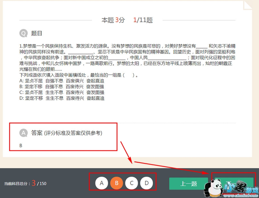 4、然后你按照你的记忆选择你当时高考时的选项,正确答案上面也有,大家可以看看,选好之后大家选择点击“下一题”