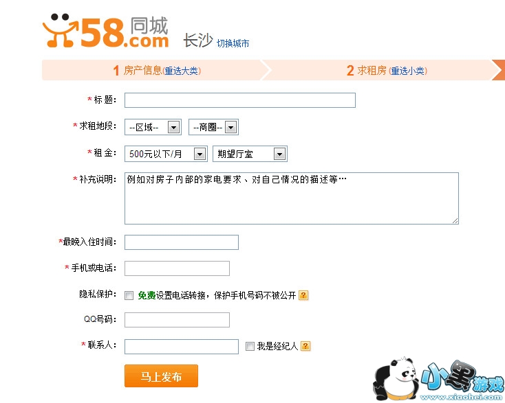 3、然后填好你的求租信息,留下你的手机号码,和正确信息就可以了,最后点击“马上发布”