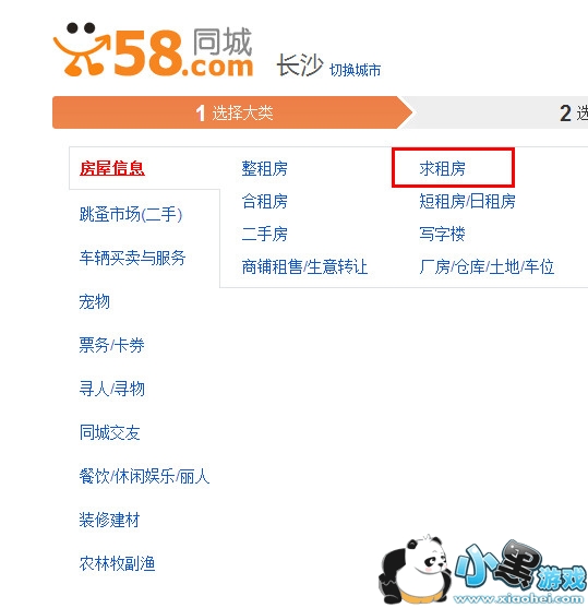 2、进入发布信息的页面将鼠标放在“房屋信息”上,然后点击“求租房”