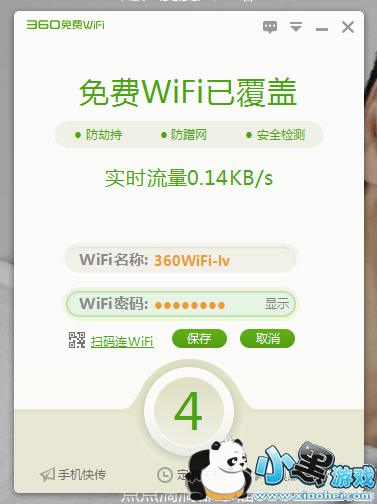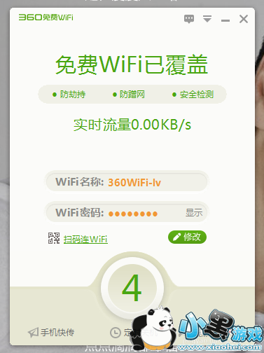第三步、下载成功之后,打开“360免费wifi”,点击“一键创建无线网络”,就能够看到WiFi名称和密码了。