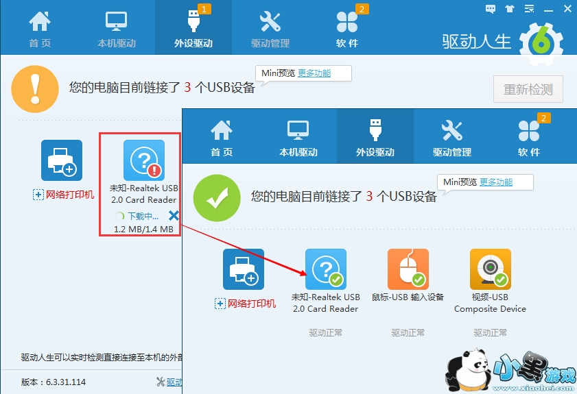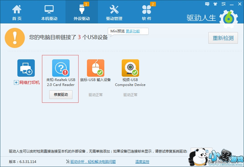 但凡接入电脑的移动设备都需要安装USB驱动,所以驱动人生特设了一个“外设驱动”专栏,电脑接入的所有移动设备的驱动状态,都可以检测出来。如下图,小编的电脑接入了3个移动设备,鼠标驱动和摄像头驱动是正常的,但驱动人生检测显示有一个未知的USB驱动不正常。