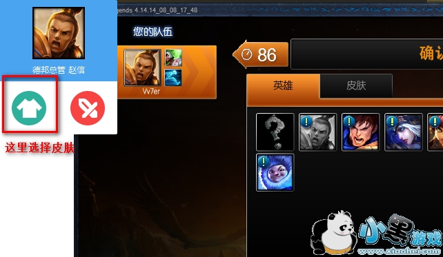 当您进入到英雄选择界面时,程序会弹出英雄选择窗口(如图所示),点击左侧的衣服图标可选择要使用的皮肤,点击右侧的长剑图标可应用推荐出装