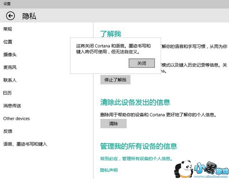 在弹出的窗口中点击“停止了解我”按钮和“清除”按钮。其实这一步就是切底关闭了微软小娜Cortana和清除了其本身的记录。这就是怎样激活微软小娜的方法,既然你的开关按钮是灰色的,我们不能选择,那我们就干脆直接关掉你。任何事情也就是如此,反其道而行,或许还能走出一条阳光大道的。如图所示: