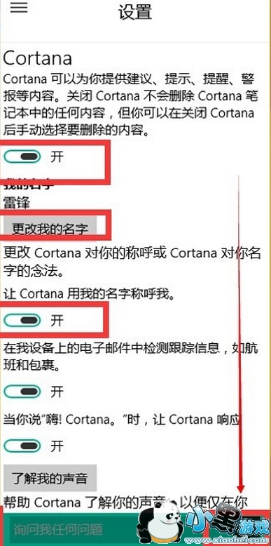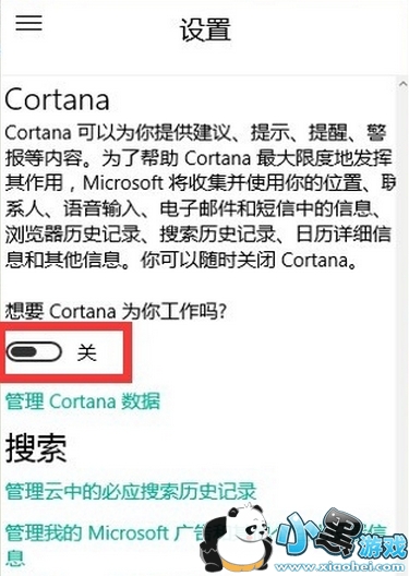 当你关掉了微软Cortana之后,你再次回到桌面,从以上我们说的第六步开始,点击Cortana的窗口,再次进入设置窗口,这时你会发现开关微软小娜的按钮已经高亮了,正在等待着你的选择,你会毫不犹豫的开启她,如图所示: