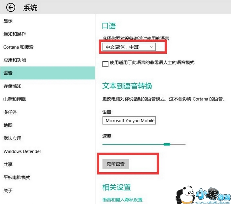 在弹出的窗口中点击系统-语言,然后设置口语为简体中文,再在下面的“文本到语言转换”里预听一下你设置的语言。如图所示: