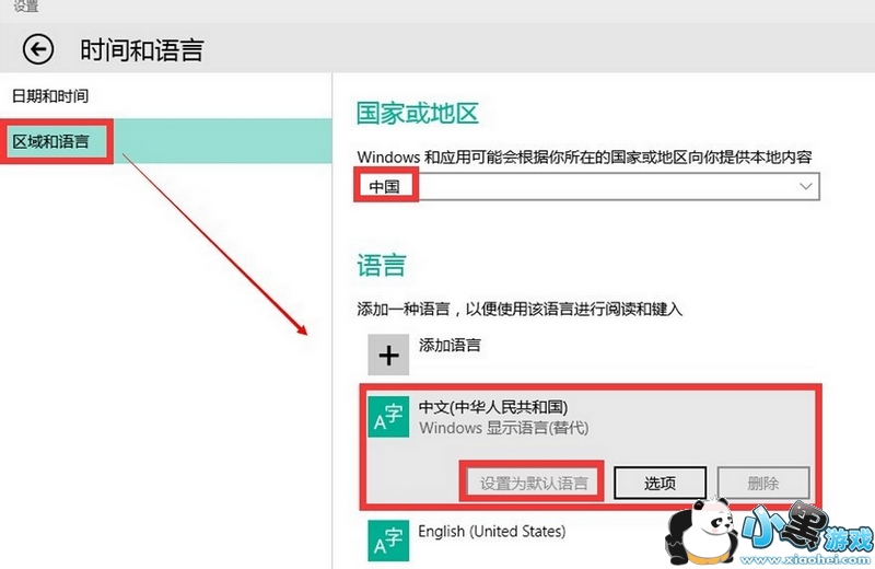 同第三步,点击时间和语言,在弹出的窗口中设置“区域和语言”,区域选择“中国”,语言选择“中文”。并且把中文设置成默认语言。点击中文图标,在伸展框里选择默认即可。如图所示: