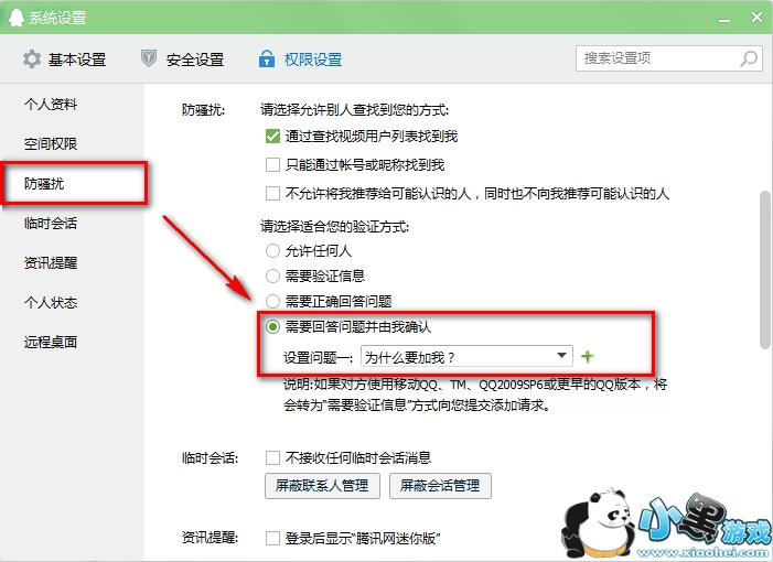 点击防骚扰之后进入到防骚扰窗口,在窗口上面点击选择需要正确回答问题,设置一个问题,好友需要正确回答问题之后才可以添加你为好友。之前的旧版本中有不允许任何人的选项,现在最新版QQ没有了,我们可以选择需要正确回答问题并由我确认选项,然后设置多个问题,最好是设置别人不知道的问题,这样就不会有人成功添加你为好友了