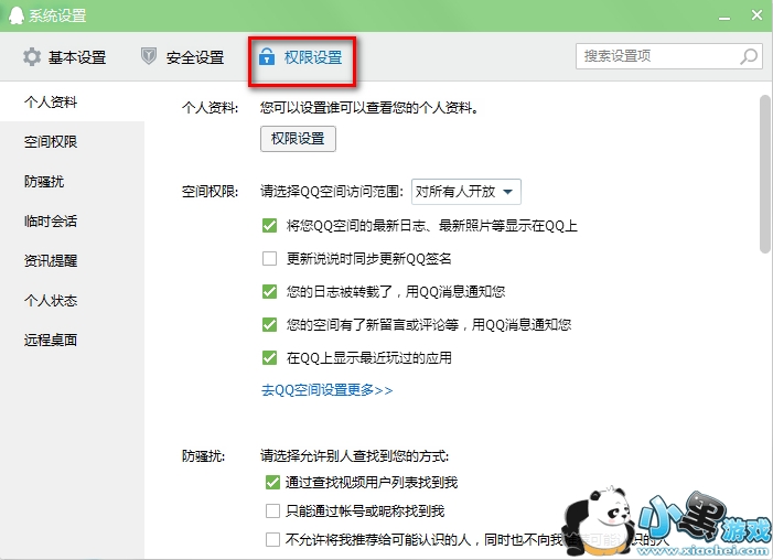 点击权限设置以后进入到权限设置窗口,在权限设置窗口左侧点击防骚扰,如图所示: