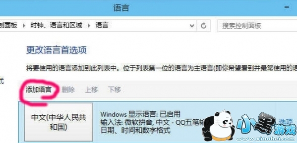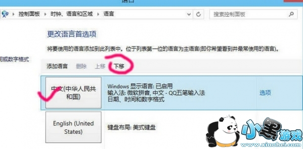 然后,选中含有微软拼音输入法的语言,点击"下移"
