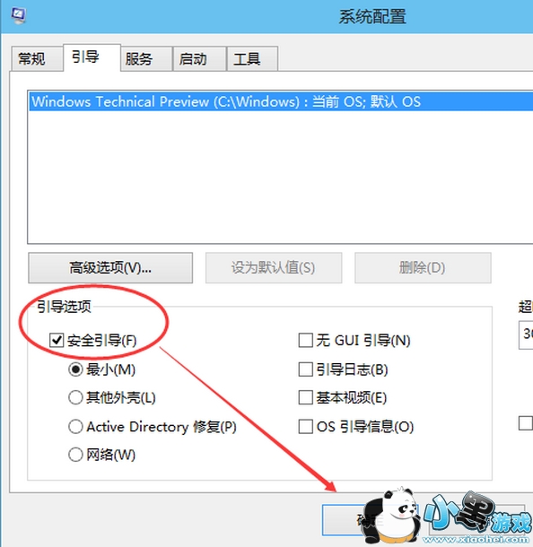 在引导选项卡窗口下,将引导选项下的安全引导(F)勾中,然后点击确定,如下图所示。