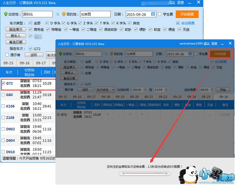 登陆到人生日历订票系统之后,将出发到达地点、出发日期、乘车人、指定车次等信息提前填写完毕,勾选“自动刷票”,然后点击开始刷票,人生日历将立即进入刷票状态。由于抢票高峰时段12306负荷过重,所以建议小伙伴们在起售前10分钟进入刷票状态,以提高抢票几率。