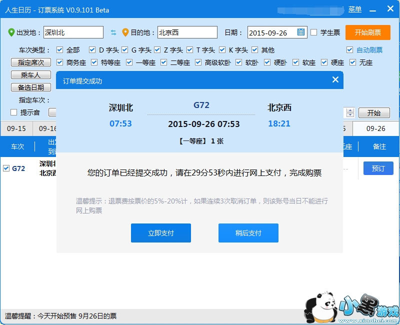 验证码提交完毕,就坐等人生日历出票啦!小编亲测,起售时间2分钟之内用人生日历抢到了一张中秋节前一天的火车票。需要提醒小伙伴的是,12306的订单支付时间由原来的45分钟缩短为30分钟,抢到票后可要把握好支付时间。