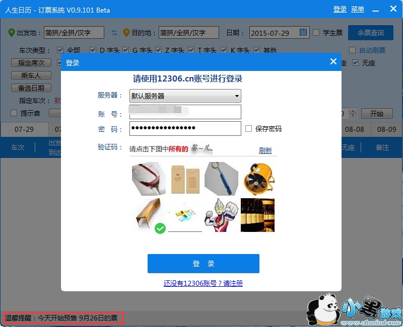 在人生日历的抢票日历上选择好自己的出行时间,然后对照抢票时间,提前做好抢票准备。如7月29日可以抢9月26日(中秋节前一天)的火车票,抢票当天提前登陆人生日历订票系统。由于12306使用图形验证码,小伙伴们可要睁大眼睛仔细辨认噢!