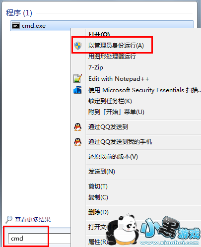 Win7 SP1:点开开始菜单搜索“cmd”然后选择右键“以管理员身份运行”打开“命令提示符”