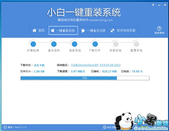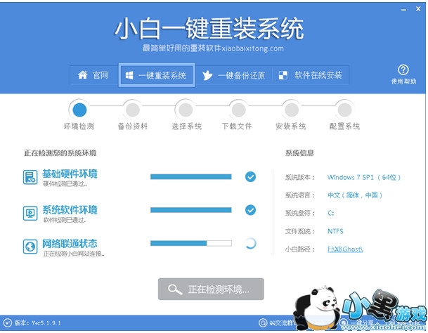 这一步骤是对电脑软、硬件环境进行一个基本的检测,确保适合系统重装。左侧是检测的项目进度,直观地看到软件在运作的过程;右侧是系统版本、磁盘系统,有一个非常重要的就是小白软件下载、备份的目录,它会自动识别电脑上的最大磁盘为系统下载、文件备份还原的路径并生成XBGhost目录,非常人性化。