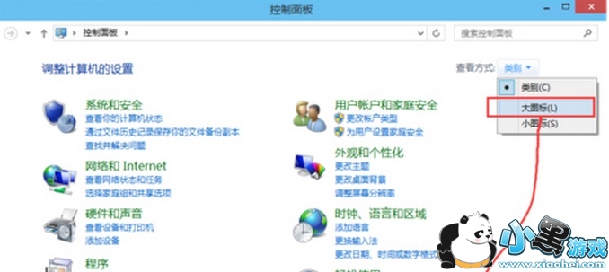 1、点击“开始“菜单,点击”控制面板”选项,然后右上角点击切换到大图标模式。