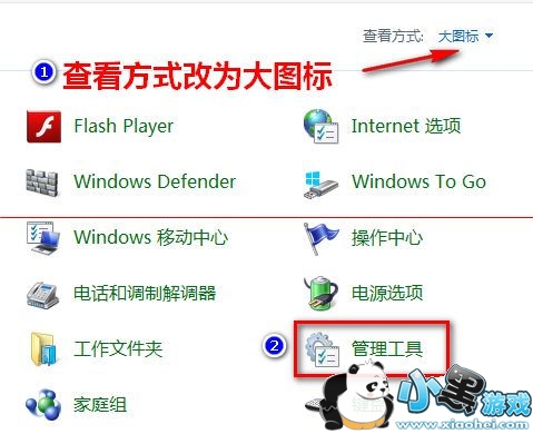 1、打开“控制面板”,将查看方式改为大图标,然后点击“管理工具”。