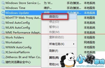 1、按照第一步的方法,找到“Windows Update”服务,右击选择”启动“。