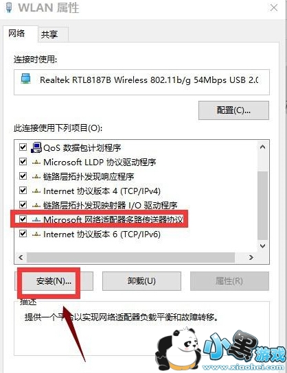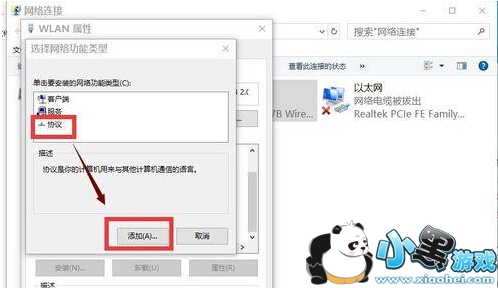打开网络共享中心-当前网络连接属性-选择协议,点击安装