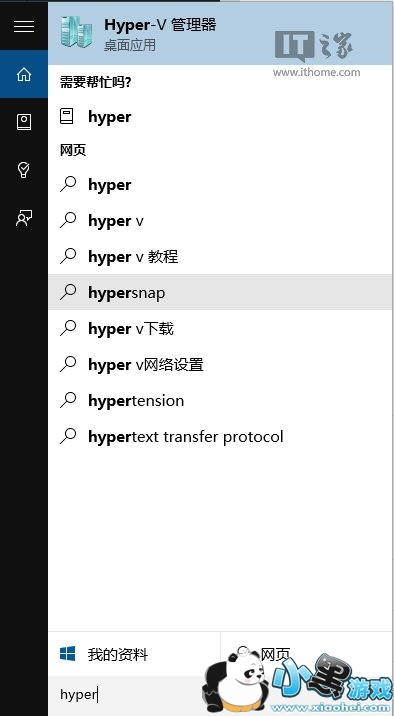 然后点击微软小娜或开始按钮搜索处,输入Hyper-V,点击上面出现的Hyper-V 管理器。
