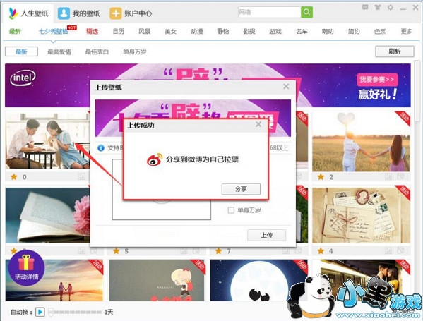参赛壁纸上传成功,你就可以将壁纸分享到微博进行拉票啦~同时您上传的壁纸也会第一时间出现在最新壁纸选项下。您 可以让您的小伙伴来为您拉票,一天可投一次,直到活动截止。