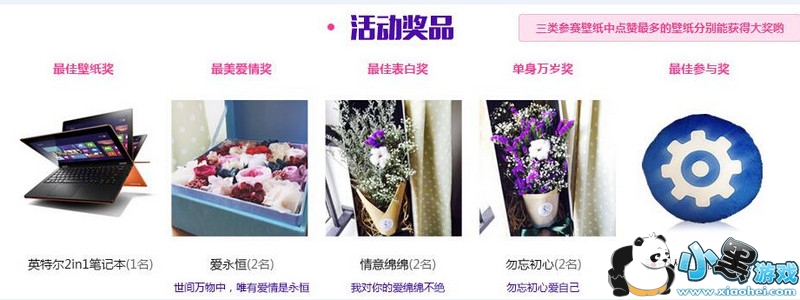 活动奖品获得规则:三类壁纸中点赞最多的壁纸分别能获得大奖!例如:您上传的壁纸在最美爱情类当中是点赞次数最多 的,那么您将获得“爱永恒”永生花!当您的壁纸是所有参赛壁纸中点赞次数最多的,那么您将能获得英特尔2in1笔记本!