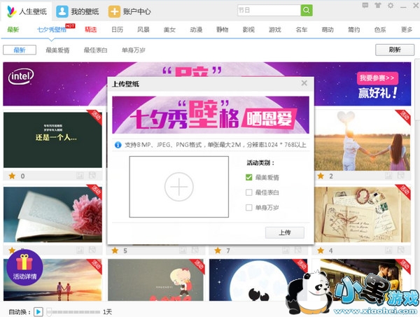 你的爱情要点赞,你的表白要让Ta看见,你的单身主义要让全世界都知道!这个七夕,人生壁纸携手英特尔,梦想家的花园 举办七夕壁纸大赛,七夕和你一起晒恩爱!只要上传有爱的壁纸参赛,并分享到微博拉票,就有可能获得英特尔2in1笔记本 和美腻永生花!具体怎么参加呢?让小编来告诉你!
