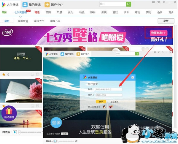 人生壁纸下载人生壁纸最新版,即可马上了解活动详情。那 么怎样上传壁纸参赛呢?在人生壁纸客户端,点击“七夕秀壁格”,找到“我要参赛”按钮,并登陆账号(注:可登陆驱动 人生账号或微博、QQ账号)。