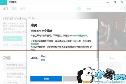 7、购买更专业版Win10升级,现在也是支持支付宝。点击【继续】这样就会提示支付宝二维码支付的界面。支付成功就会购买成功。