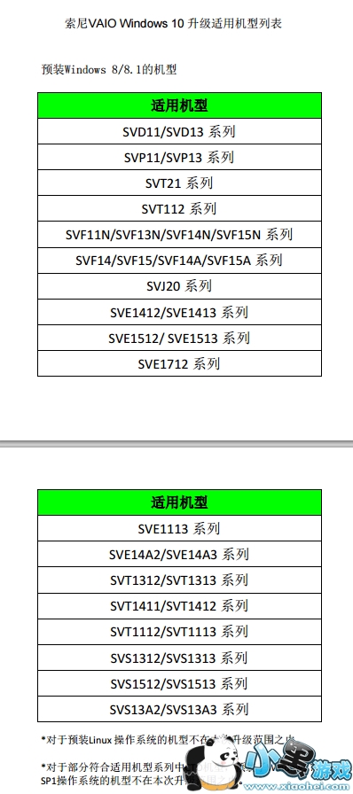 下面是索尼VAIO个人电脑Win10升级适用支持机型的具体列表