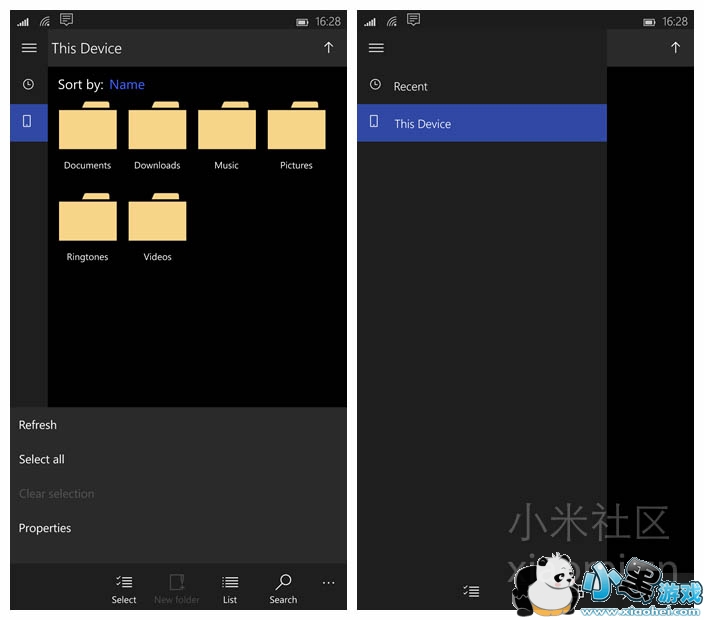 Win10版小米4中的文件管理支持批量操作文件,复制/粘贴,搜索,查看近期文件,查看文件属性等常用操作。