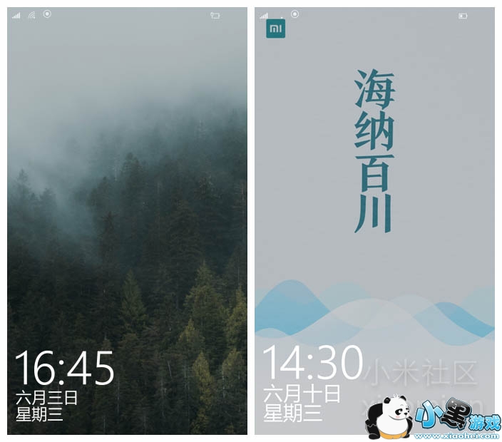 Win10版小米4的锁屏界面可以直观的看到浸透式状态栏,左下方显示当前的时间、日期和星期。锁屏壁纸可以在设置中在线选择,也可以导入本地精彩美图(左下方是Bing推荐的世界各地美景,右下方则是小米沟通会的海报图)。在锁屏界面不设密码的情况下只可进行两项操作,在屏幕上方下拉显示通知中心;上划进行解锁屏幕,进入系统桌面。
