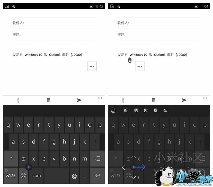 通过以下图片,细心的用户可以发现Win10版小米4内置的输入法新增了虚拟键盘,你可以通过“长按方向键向各个方向划动”来控制光标的移动。