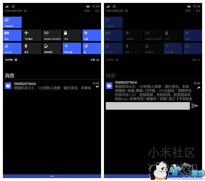 Win10版小米4的通知栏可以在任何界面通过下拉屏幕打开,全屏状态下可以看到更多的快捷设置以及通知内容。同样的,轻点图标进行某项功能的开关,长按某个设置可以进入详细的设置界面,非常方便。